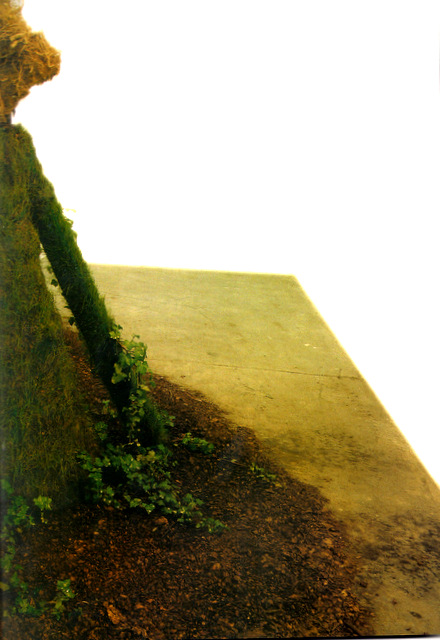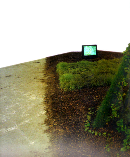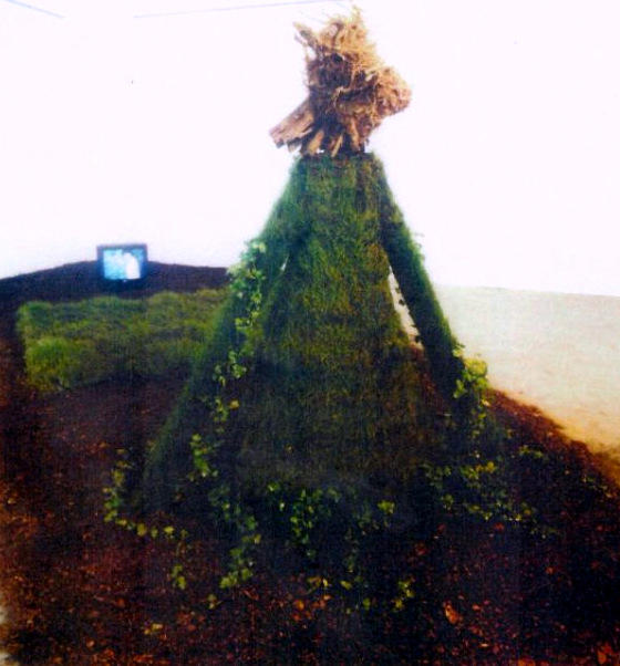 'Genesis' video on the screen, fading vegetation on the soil, performance of the artist watering everyday the fading vegetation, plant sculpture with root head just watching...